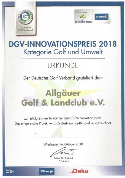 Nun hat der Golfclub Ottobeuren, silberzertifizierter GOLF&NATUR-Klub, Post von DGV-Präsident Claus M. Kobold bekommen. In dem Brief schreibt er: "[...] Als Anerkennung für Ihre erfolgreiche Teilnahme am DGV-Innovationspreis mit Ihrem Best-Practice-Beispiel, möchten wir Ihnen die beigefügte Urkunde überreichen [...] Wir hoffen, dass die Urkunde einen wertschätzenden und sichtbaren Platz auf Ihrer Golfanlage erhält und dabei hilft, Ihr Team und Ihre Mitglieder für ähnlich laufende und anstehende Projekte zu motivieren. [...]"